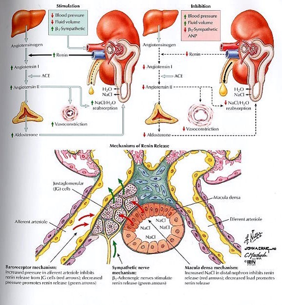 Angiotensinogen + renin -> angiotensin I ->(ACE) angiotensin II –> aldosterone