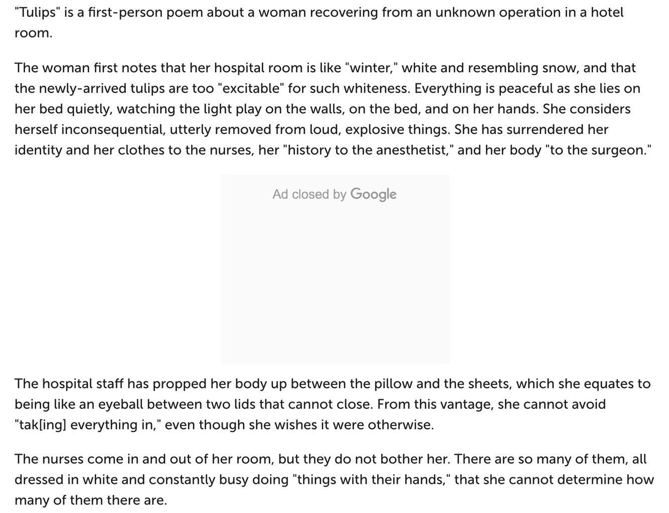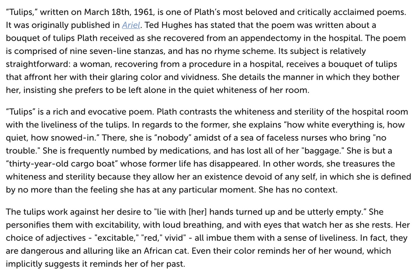 Ted Hughes says she wrote ‘Tulips’ after being hospitalized for an appendectomy in March of 1961. She had miscarried just a short time before this operation; probably the second hospital confinement triggered associations with death and birth.