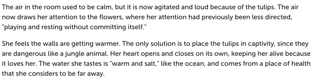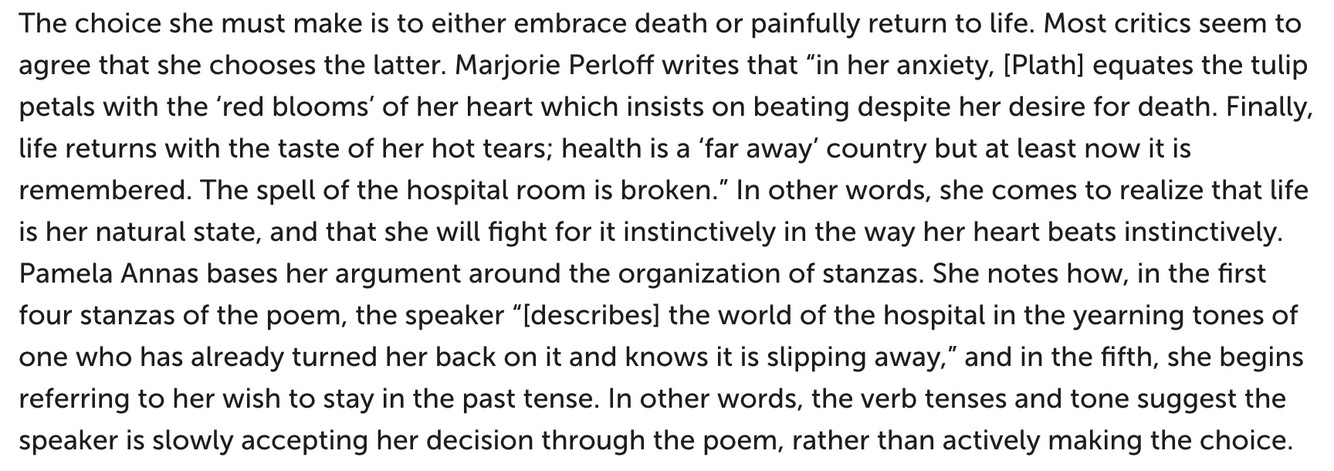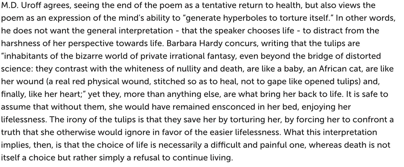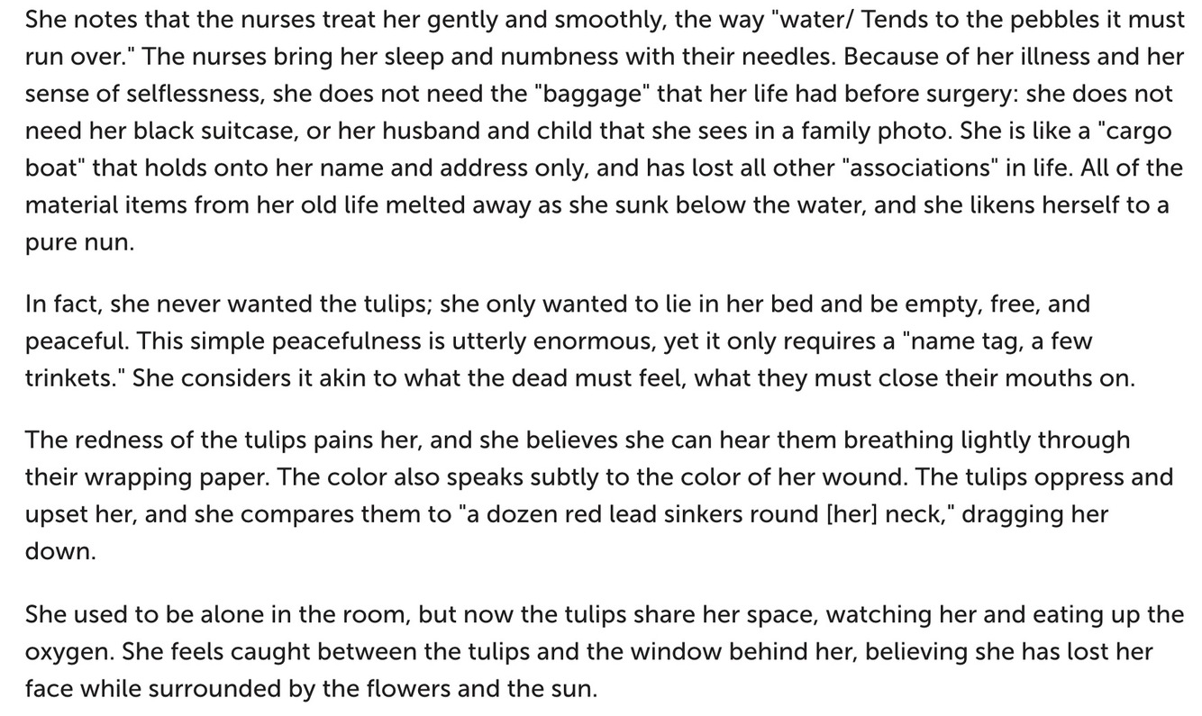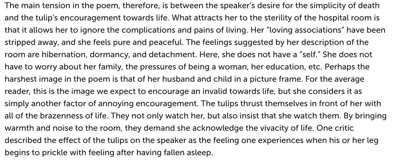 On the other hand, while the dead are mentioned in this stanza, there is no clear evidence that the speaker wants to die in this poem. In fact, in the next two stanzas, she is upset that the tulips threaten her life. They are “red lead sinkers round my neck” and they “eat my oxygen.” She desires something else, something white and pure, which rejects the vivid tulips, suggesting that her desire “to efface myself” is something other than death.