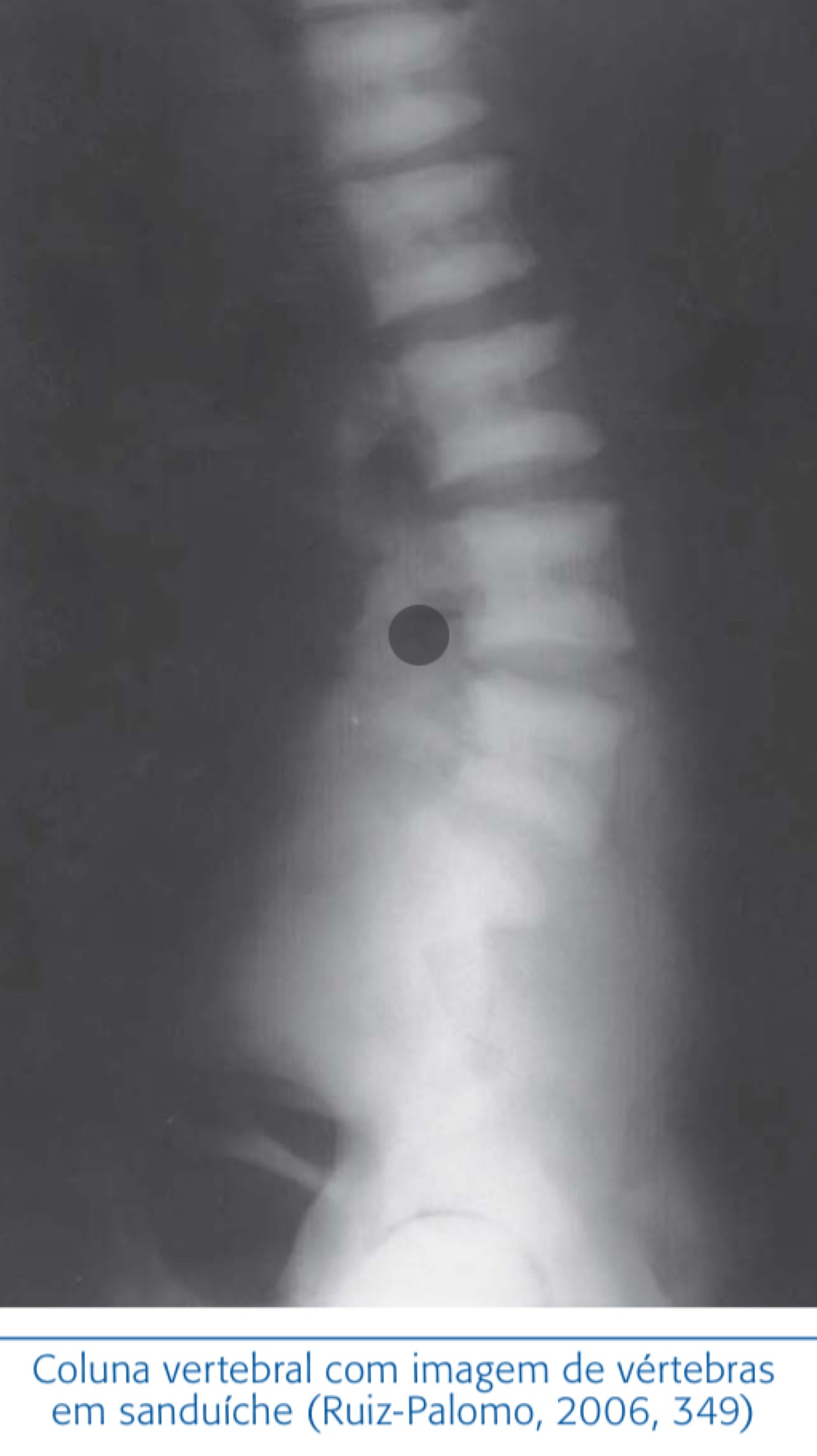 Rx esclerose generalizada (densidometria óssea elevada), “novo osso” (formação de osso dentro do osso) e espessamento das placas vertebrais (vértebra em sanduíche)