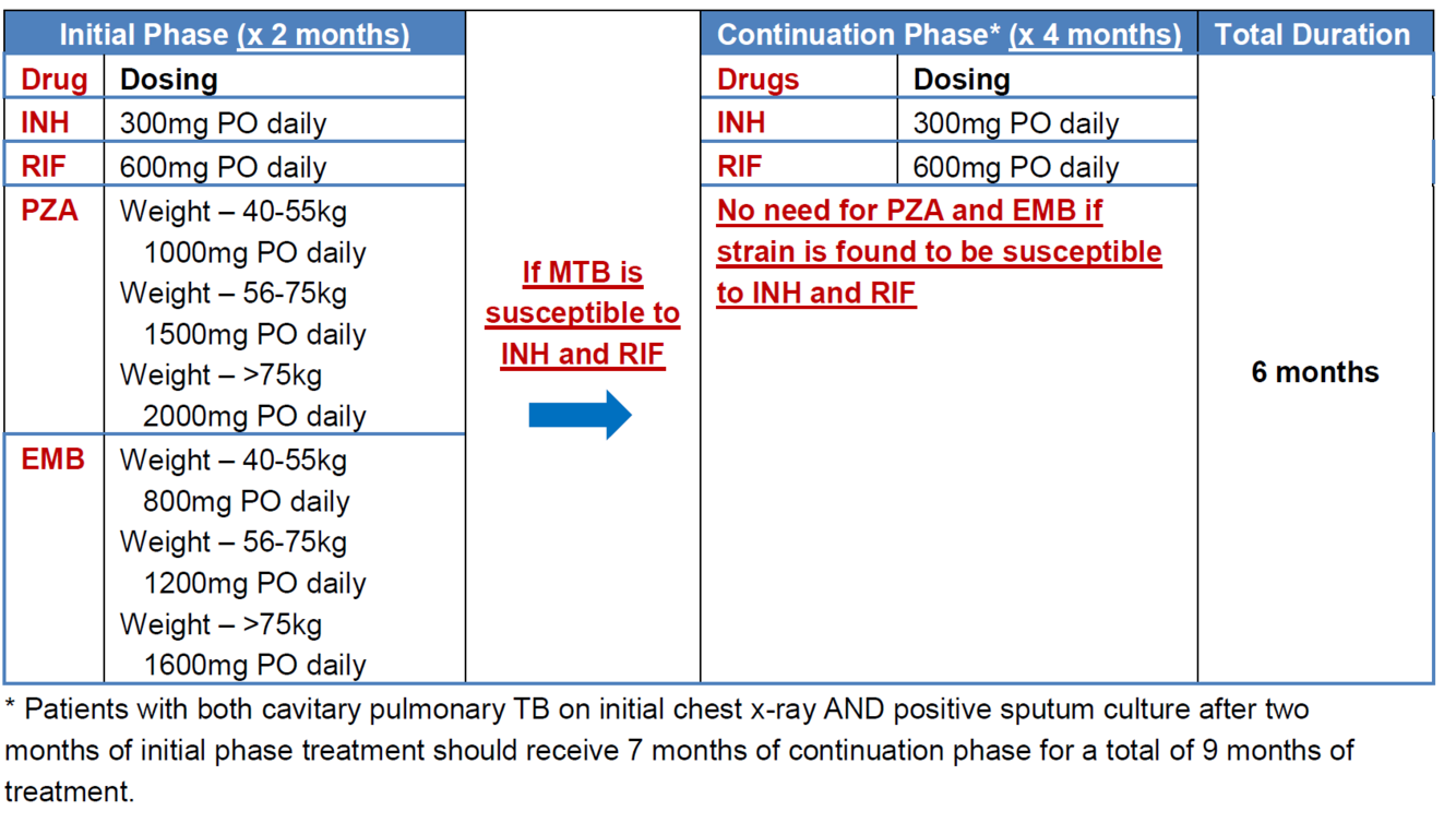 The initial phase consists of a standard four-drug regimen of isoniazid (INH), rifampin (RIF), pyrazinamide (PZA), and ethambutol (EMB) for ~two months. if no INH or rifampin resistance is detected, the continuation phase may begin with a two-drug regimen of INH and rifampin for an additional 4 months