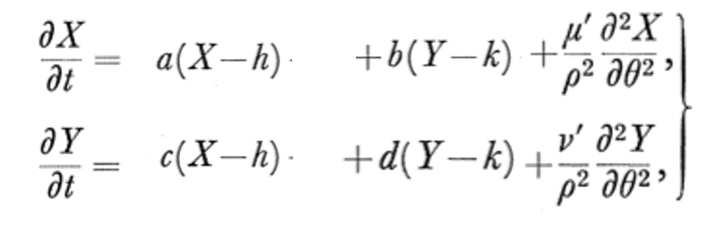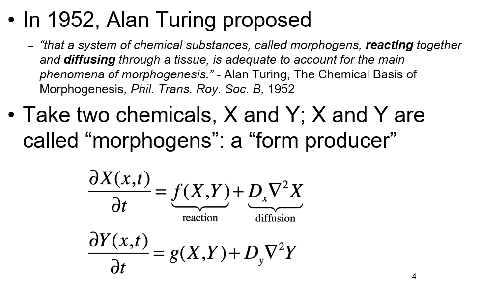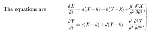 For Y to diffuse much faster than X, a>0 (autocatalysis), and b<0 (Y -| X). Y then produces an inhibition halo that keeps the spread of X limited However, Ys inihbition on X should be at the right level relative to the autocatalysis of X to ensure that X is also not completely destroyed.