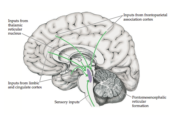 Le système de la conscience est formé par le cortex d’association frontopariétal médial et latéral, avec l’aide des circuits d’éveil dans le tronc cérébral supérieur et le diencéphale. Ce système de conscience régule le niveau de conscience d’une personne selon les afférences des systèmes sensitifs, moteurs, de la mémoire et des émotions.