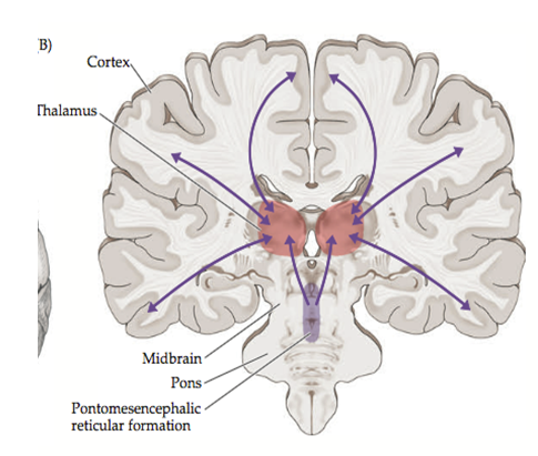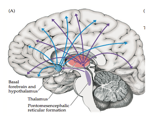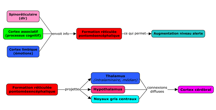 Hypothalamus + Système limbique + Différents cortex d’associations + Voies ascendantes = Afférences sensitives –> Envoyées à la formation réticulée (déclenche éveil = état d’alerte) –> Projette au Thalamus + Hypothalamus + Télencéphale basal (sont des relais) –> Tous projettent ensuite vers le cortex.