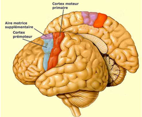 Cortex prémoteur : Situé en antérieur du cortex moteur primaire, sous l’aire motrice supplémentaire et en surface latérale du lobe frontal.