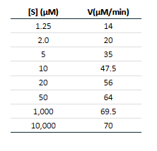 Estimate the Vmax and KM of the enzyme-catalyzed reaction for which the data in the table were obtained.