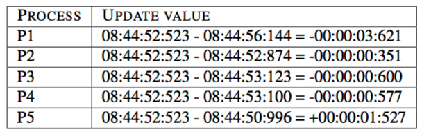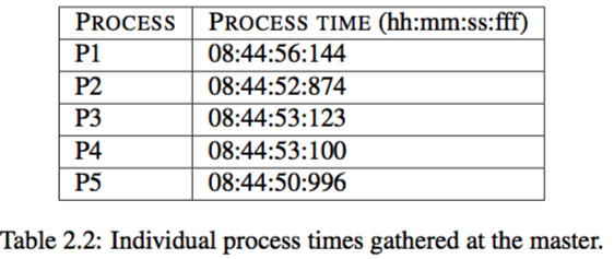 A collection of five processes (P1 - P5) want to synchronize their clocks according to the Berkeley algorithm. Process P3 has been elected as the master. The threshold value for acceptable deviation δ = ±3000ms. For the given round of the algorithm, the times of all individual processes have been collected by the Master (cf. Table 2.2). (Hint: Different to the original Berkeley algorithm, the master did not record any RTTs in this setting. So for this task, you can omit the calculation of a better estimate for the individual process times and instead work with the times given in the table.)