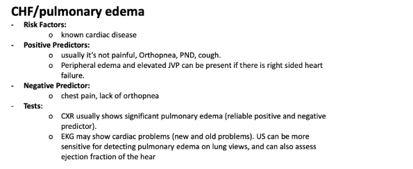 What are the positive predictors of CHF/pulmonary edema? (x3)