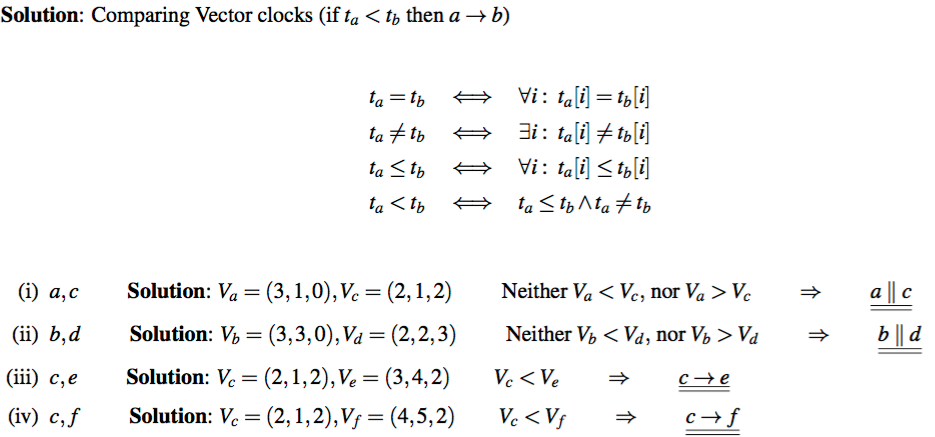 Using only the Vector Clock timestamps calculated in subtask (b) show whether, for each of the below event pairs, the happened-before relation (→) holds or not. Two events that are not in happened-before relation are also called concurrent (∥) events.