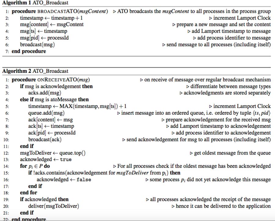 Design an algorithm to provide the system with this feature using Lamport clocks and process IDs. Hint: Write two pseudo code snippets. One describes the algorithm on the sender side (i.e., function broadcastATO(msg)), the other describes the algorithm on the receiver side (i.e., function onReceiveATO(msg)). In the pseudo code, you are allowed to use basic data structures like arrays, lists, queues, etc. with a simplified syntax.