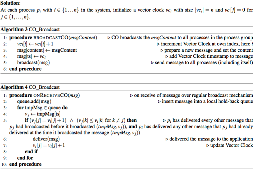 Given the following definition and the logical clock algorithms discussed in the lecture, provide an algorithm to implement Causally-ordered broadcast (CO-broadcast). CO-broadcast extends the usual broadcast semantics with the following properties: (Note: → is the happens-before relation).