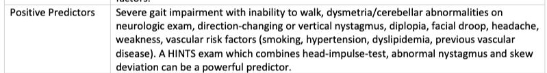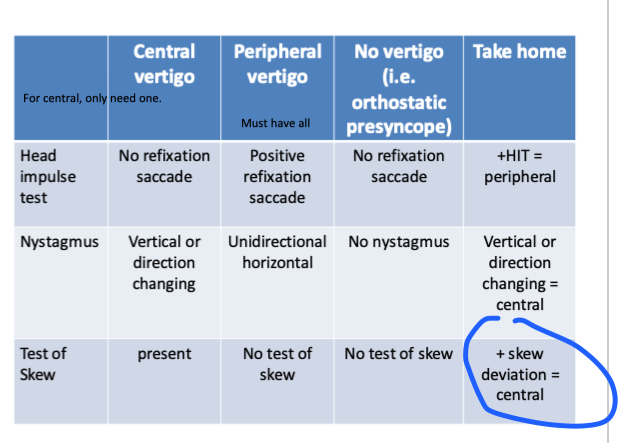 Therefore, if the patient does not have a refixation saccade OR has vertical / direction changing nystagmus OR has skew deviation, then it is a central cause of vertigo (You only need one of the three)
