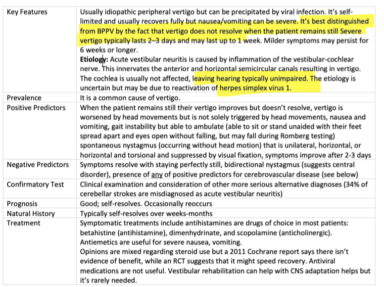 NOTE: Just because someone turns their head and their vertigo is worse, it does not mean its BPPV. Almost all causes of vertigo, whether peripheral or central, will worsen with head movement. BPPV is different because it is short, episodic, and triggered by head movement. It is confirmed with bedisde testing, such as the Dix-Hallpike, or other provocative maneuvers