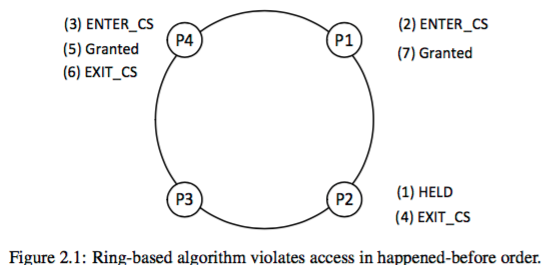 The processes in the ring-based algorithm are granted entry to the critical section in the order they are arranged on the ring. For example if the process situated counter-clockwise right next to the process holding the token is requesting access to the critical section and while the token is being passed, another process is also requesting access, by the time the token gets to the second requesting process, this one will get access although it requested it later (cf. Figure 2.1).