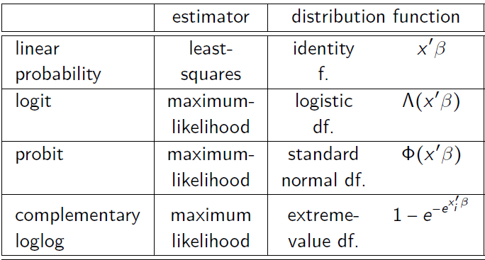 What are the distribution functions for linear probability, logit, probit and complementary loglog?
