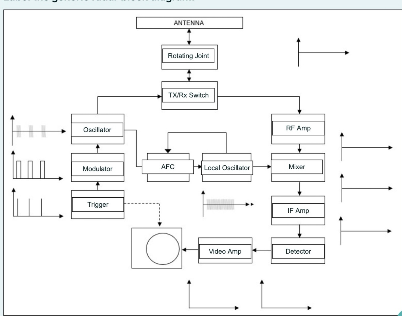 Draw and label generic radar system, explain each function and draw an example pulse train for each point