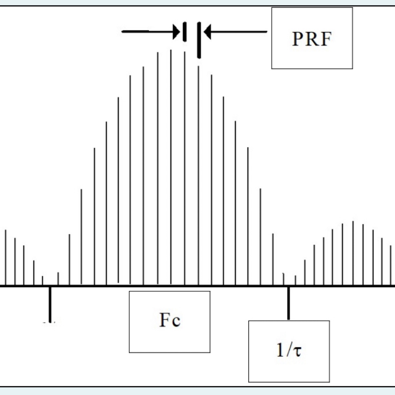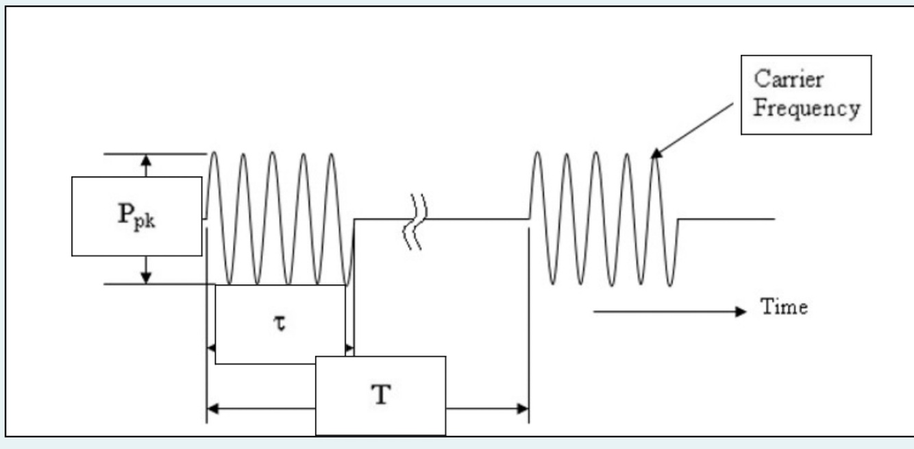 Draw a typical radar pulse train in the frequency domain labelling Peak Power,