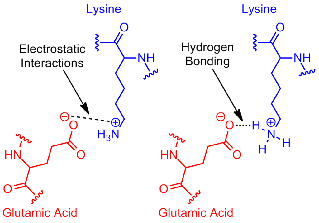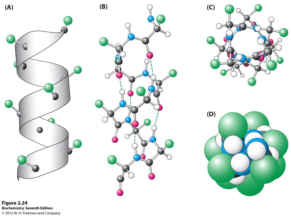Side chains in an α-helix are projected outwards; there is NO space in the middle for small molecules as the backbone fills most of the interior; there are alpha-helices that are the same; salt-bridges = electrostatic interaction between a positively-charged group and a negatively charged group, mediated by a hydrogen bond
