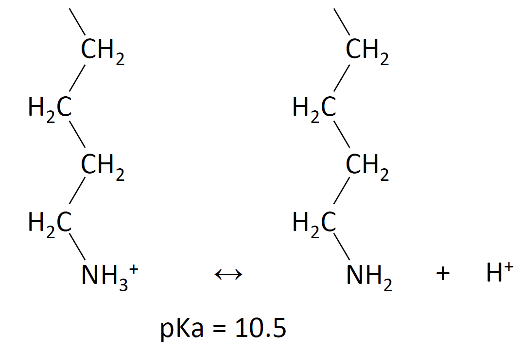 A and D are wrong because amines never have a negative charge; predominant charge states are reliant on base strength and pH; C isn’t true because, at pH=10.5, there is an equal balance of both species; B is correct because, as the pH is lowered, there are more protons around which will create more of the protonated state