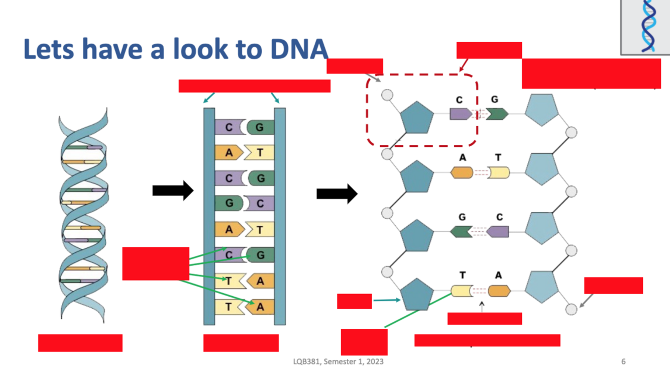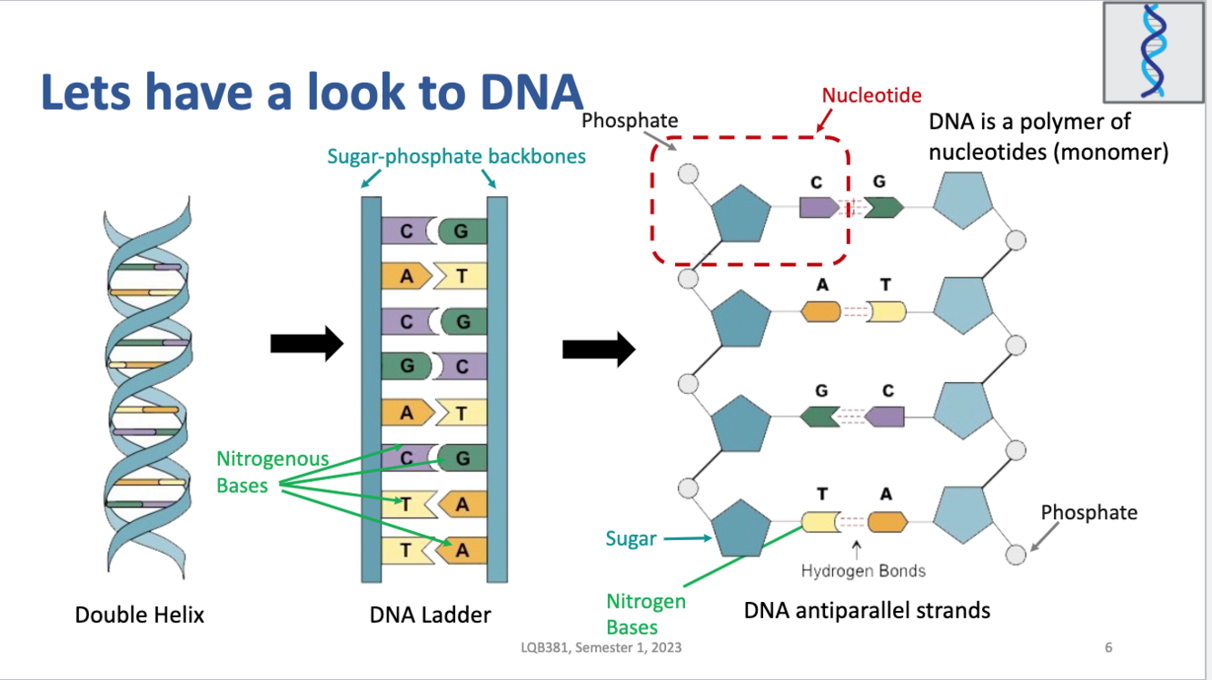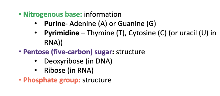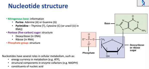 Identify the structure of nucleotides (list the three key structures, their parts, and the roles of nucleotides)
