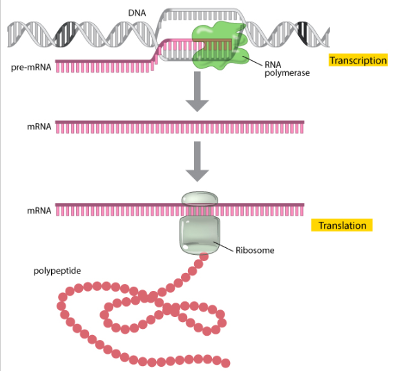 During transcription, the enzyme RNA polymerase (green) uses DNA as a template to produce a pre-mRNA transcript (pink). The pre-mRNA is processed to form a mature mRNA molecule that can be translated to build the protein molecule (polypeptide) encoded by the original gene.