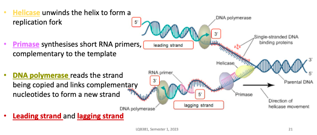 Explain the DNA replication process, the mechanism that unwinds the helix, the thing that synthesises short RNA primers, and the one that forms the new strand