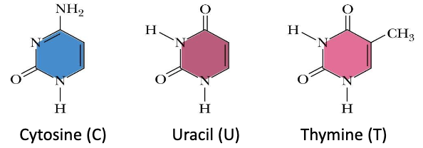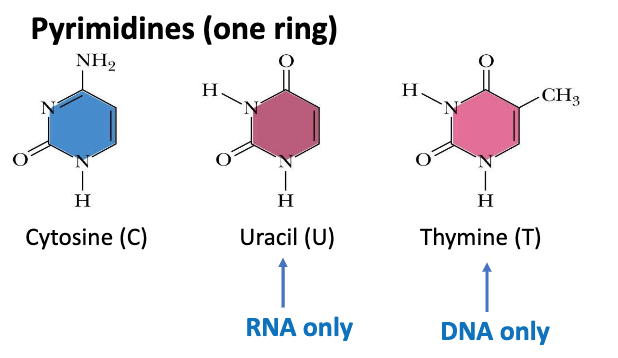 Label the type of nitrogenous base these are and name them - include which is present only in RNA and which in DNA
