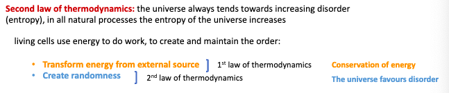 Cells transform free energy into…? Following which law of thermodynamics?