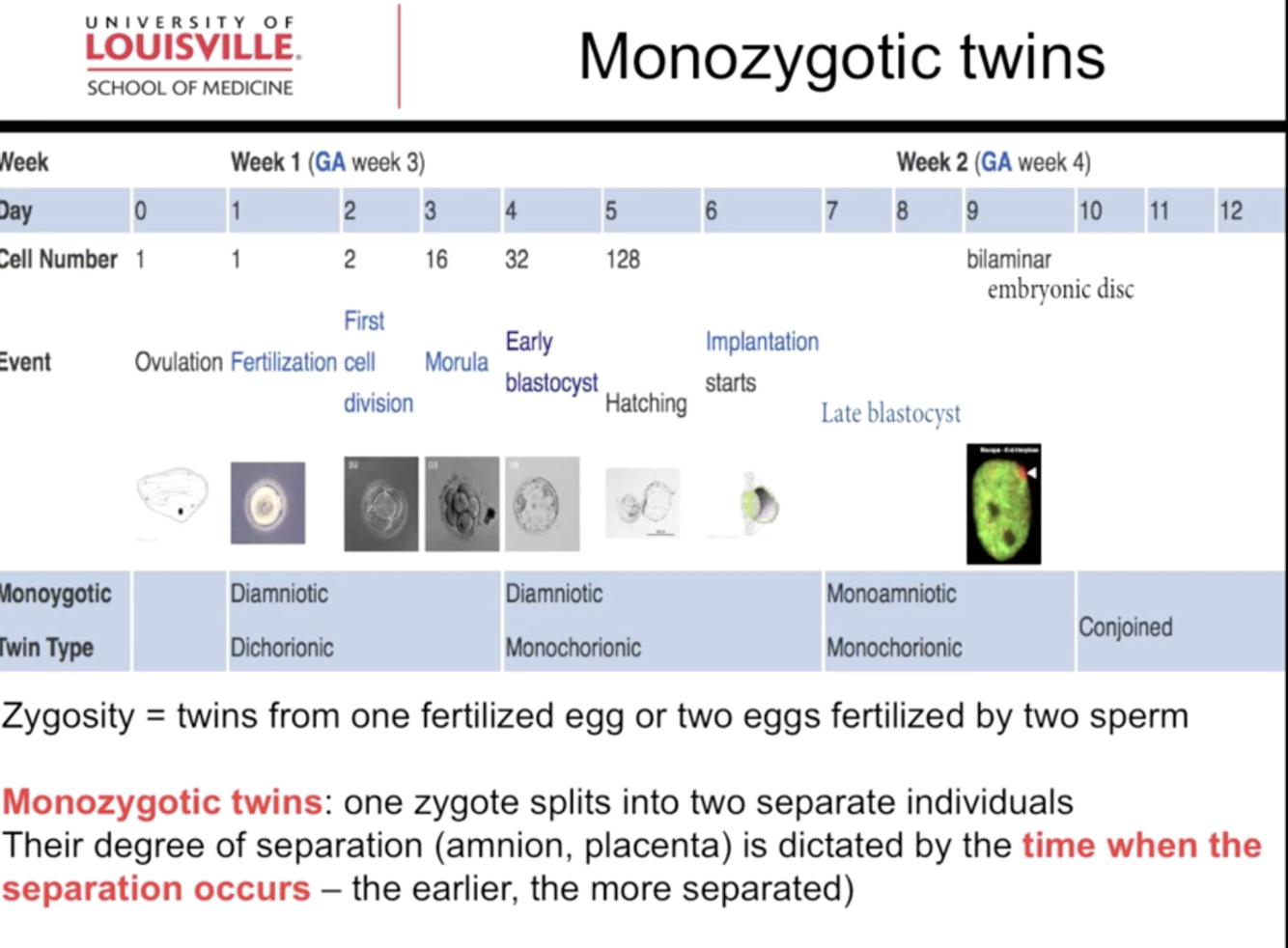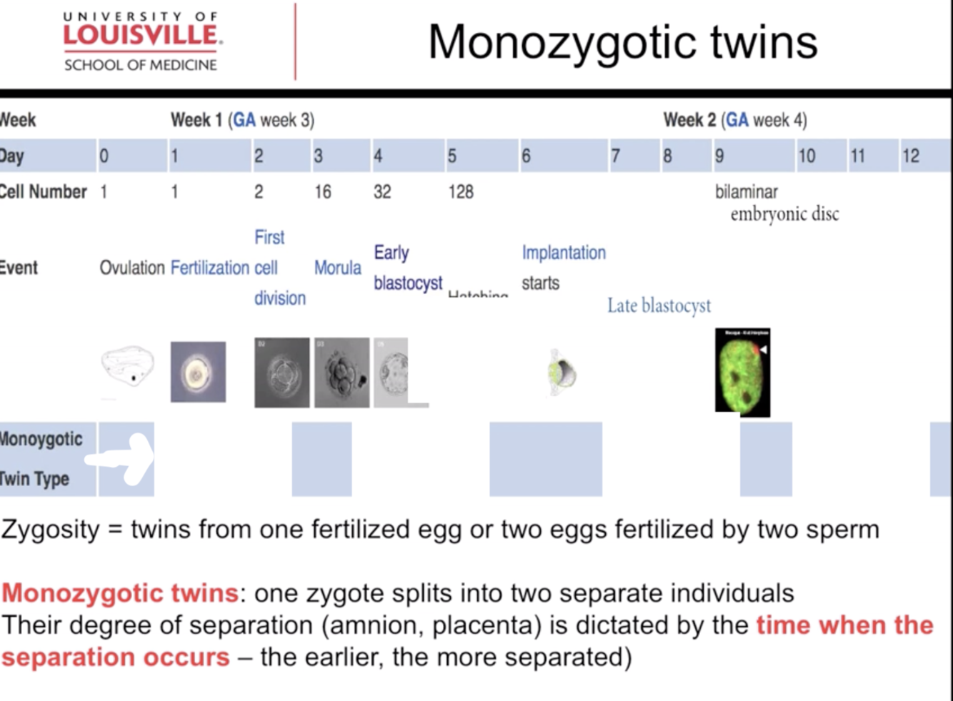 the splitting occurs at the early blastocyst stage (approximately 4-8 days)