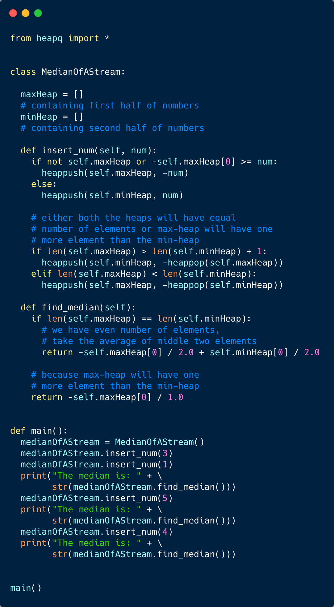 insertNum(int num): stores the number in the classfindMedian(): returns the median of all numbers inserted in the classIf the count of numbers inserted in the class is even, the median will be the average of the middle two numbers.