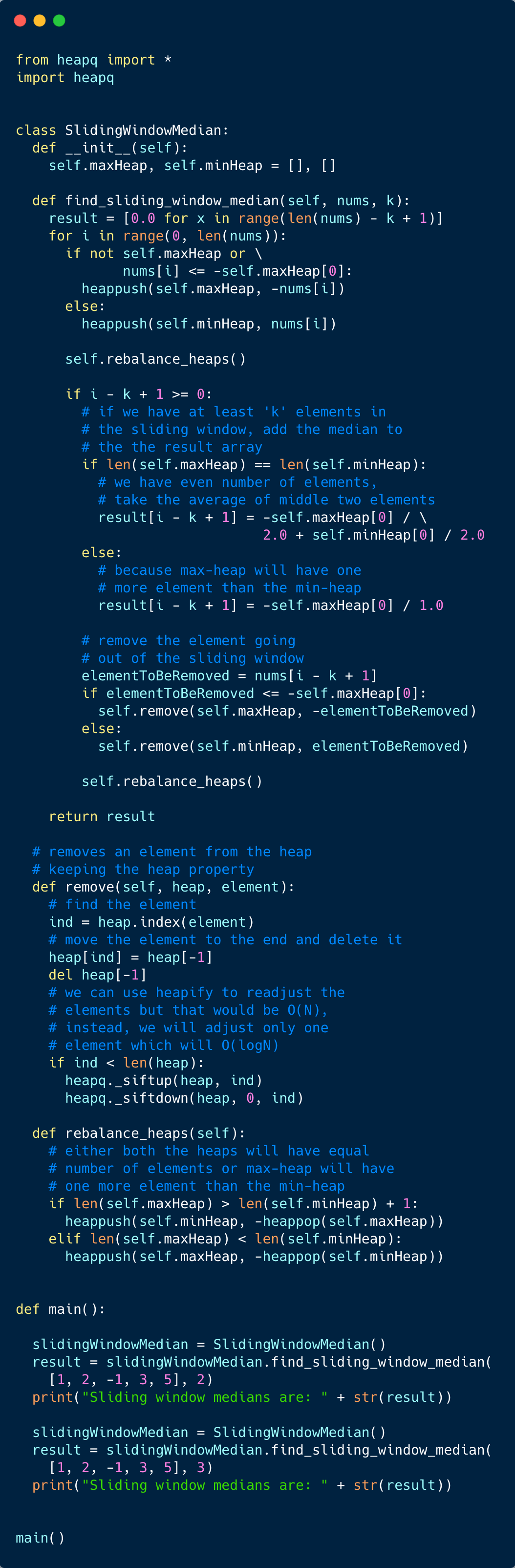 The only difference is that we need to keep track of a sliding window of ‘k’ numbers. Which means, in each iteration, when we insert a new number in the heaps, we need to remove one number from the heaps which goes out of the sliding window. After the removal, we need to rebalance the heaps in the same way that we did while inserting.