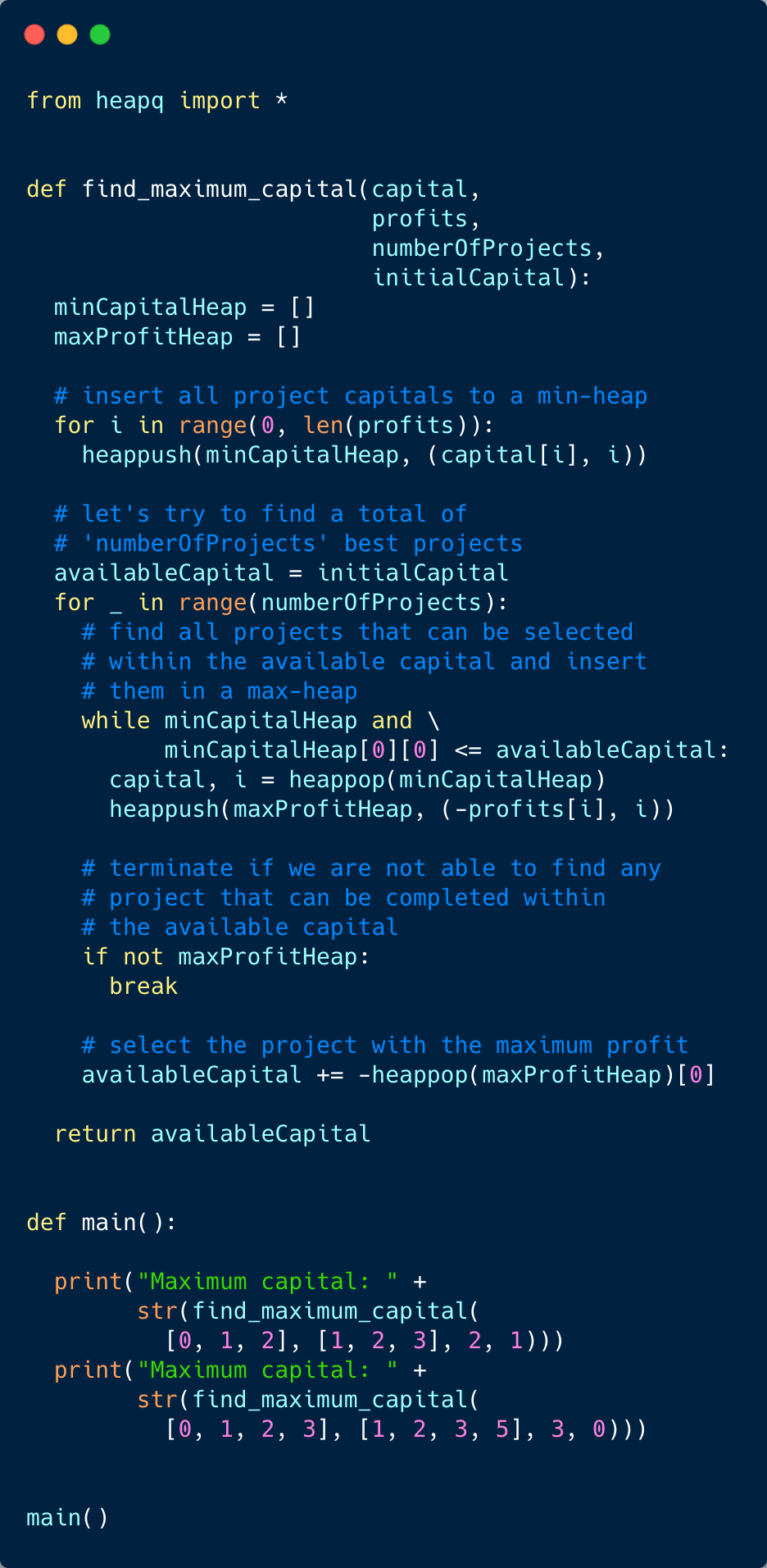 Since, at the most, all the projects will be pushed to both the heaps once, the time complexity of our algorithm is O(NlogN + KlogN), where ‘N’ is the total number of projects and ‘K’ is the number of projects we are selecting.