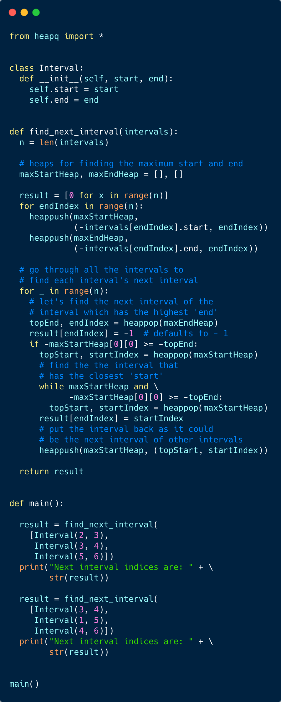 We can utilize the Two Heaps approach. We can push all intervals into two heaps: one heap to sort the intervals on maximum start time (let’s call it maxStartHeap) and the other on maximum end time (let’s call it maxEndHeap). We can then iterate through all intervals of the maxEndHeap to find their next interval. Our algorithm will have the following steps: