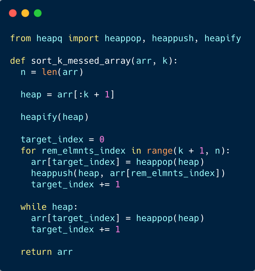Time Complexity: building a heap takes O(K) time for K+1 elements. Insertion into and extraction from the min-heap take O(log(K)), each. Across all three loops, we do at least one of these actions N times, so the total time complexity is O(N⋅log(K)). if K is substantially smaller than N, then we can consider log(K) constant and argue that the complexity is practically linear.