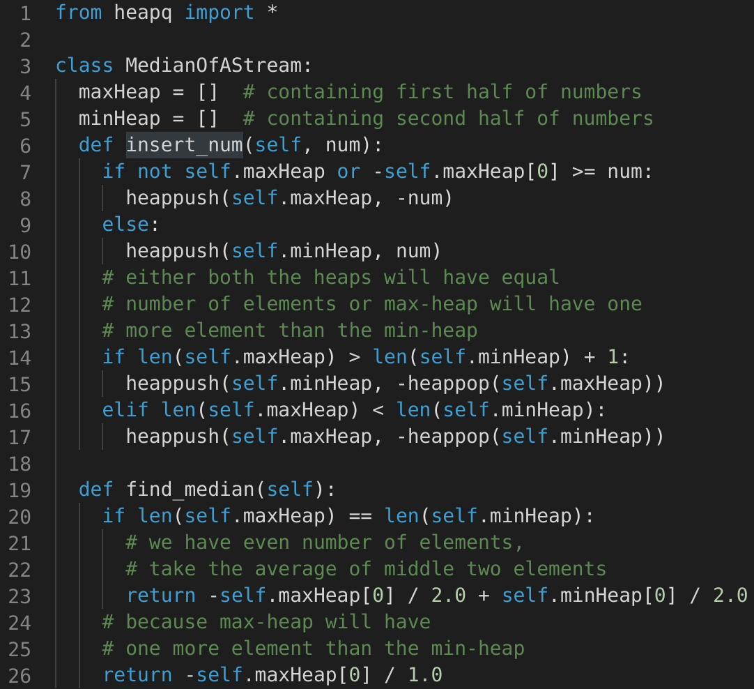 insertNum(int num): stores the number in the classfindMedian(): returns the median of all numbers inserted in the classIf the count of numbers inserted in the class is even, the median will be the average of the middle two numbers.