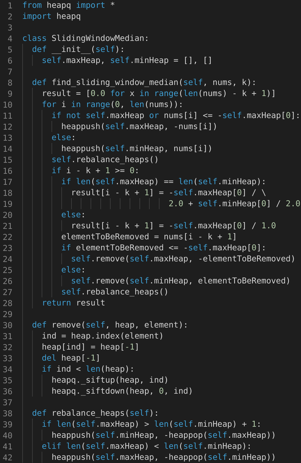 The only difference is that we need to keep track of a sliding window of ‘k’ numbers. Which means, in each iteration, when we insert a new number in the heaps, we need to remove one number from the heaps which goes out of the sliding window. After the removal, we need to rebalance the heaps in the same way that we did while inserting.