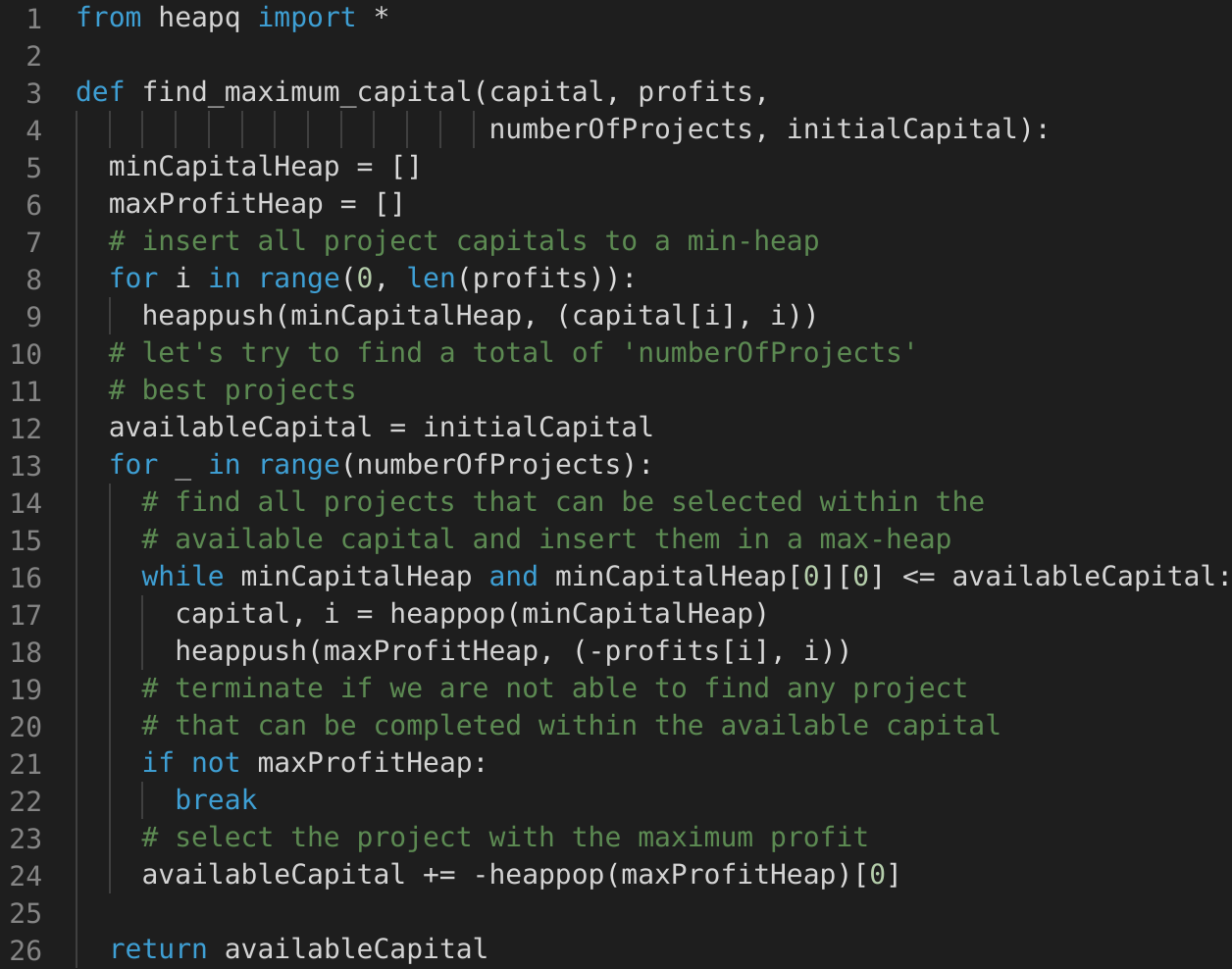 Since, at the most, all the projects will be pushed to both the heaps once, the time complexity of our algorithm is O(NlogN + KlogN), where ‘N’ is the total number of projects and ‘K’ is the number of projects we are selecting.