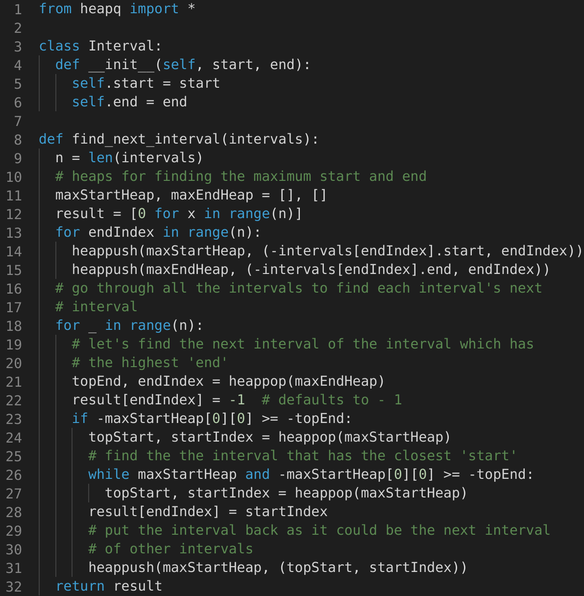 maxEndHeap to find its next interval. Let’s call this interval topEnd.maxStartHeap with the closest start greater than or equal to the start of topEnd. Since maxStartHeap is sorted by ‘start’ of intervals, it is easy to find the interval with the highest ‘start’. Let’s call this interval topStart.topStart in the result array as the next interval of topEnd. If we can’t find the next interval, add ‘-1’ in the result array.topStart back in the maxStartHeap, as it could be the next interval of other intervals.maxEndHeap.The time complexity of our algorithm will be O(NlogN), where ‘N’ is the total number of intervals.