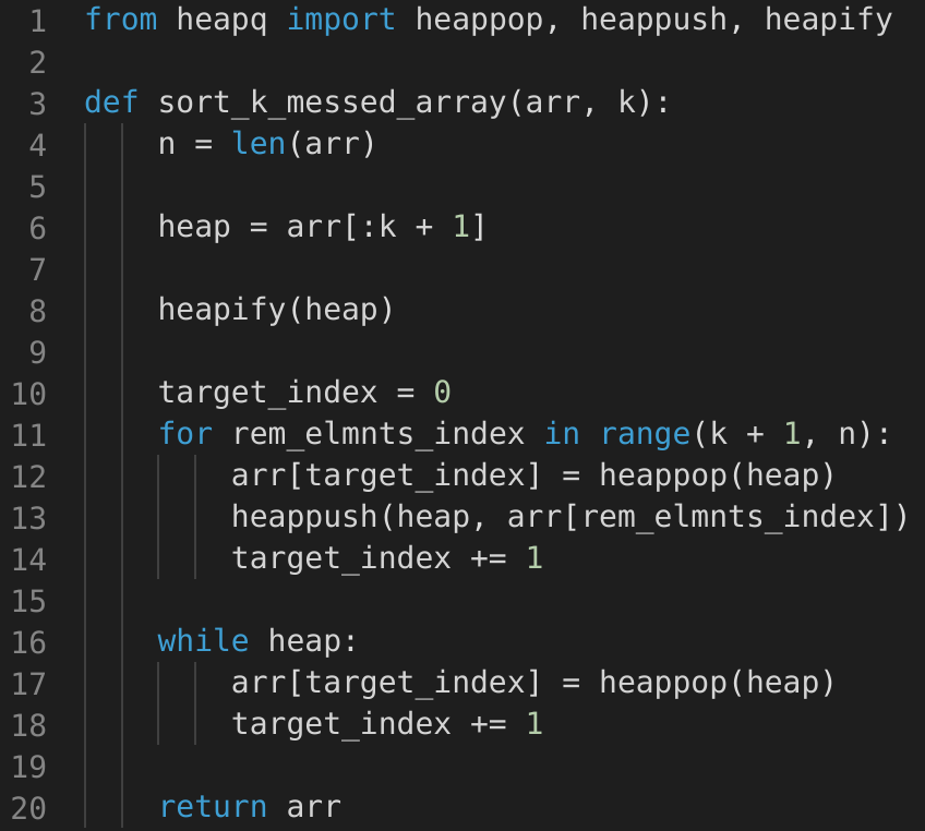Given an array of integers arr where each element is at most k places away from its sorted position, code an efficient function sortKMessedArray that sorts arr. For instance, for an input array of size 10 and k = 2, an element belonging to index 6 in the sorted array will be located at either index 4, 5, 6, 7 or 8 in the input array.