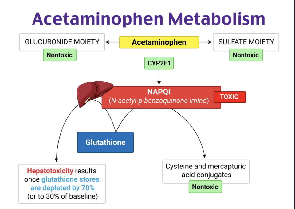 Acetaminophen→ NAPQI via P450 (toxic metabolite) → glutathione → non toxic metabolites