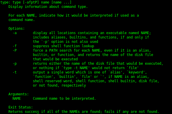 -t, Output a single word which is one of ‘alias’, ‘keyword’, ‘function’, ‘builtin’, ‘file’ or ‘’, if NAME is an alias, shell reserved word, shell function, shell builtin, disk file, or not found, respectively.