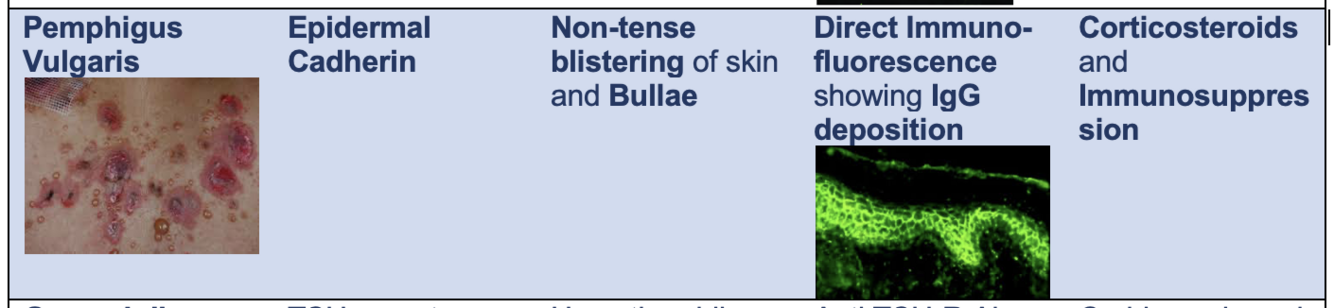 Type II reaction - antibodies against epidermal cadherin → non-tense blistering of the skin and bullae formation