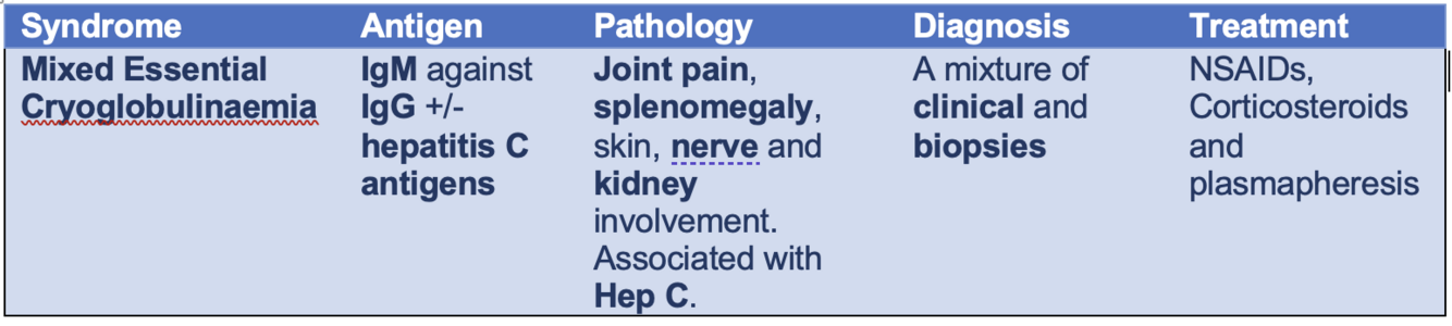 IgG/IgM immune complexes in blood +/- hep C antigens → joint pain, splenomegaly, nerve and kidney involvement