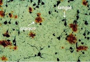 What do neurofibrilliary tangles and senoid plaques look like?