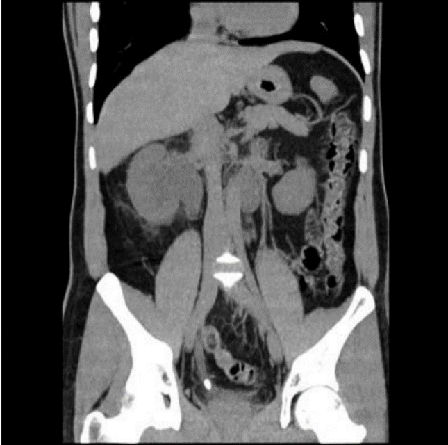 Sedan tidigare väsentligen frisk. Han uppsöker vårdcentralen pga. intervallartad högersidig smärta i flanken med utstrålning mot ljumsken. Jon remitteras till akutmottagningen pga. smärta, feber samt höga infektionsparametrar. Efter undersökning av Jon beställer jourhavande läkare undersökning med datortomografi