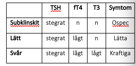 Lätt – där TSH är högt, t4 lågt men t3 normalt. Ofta lätta symtom som kan vara svåra att förstå