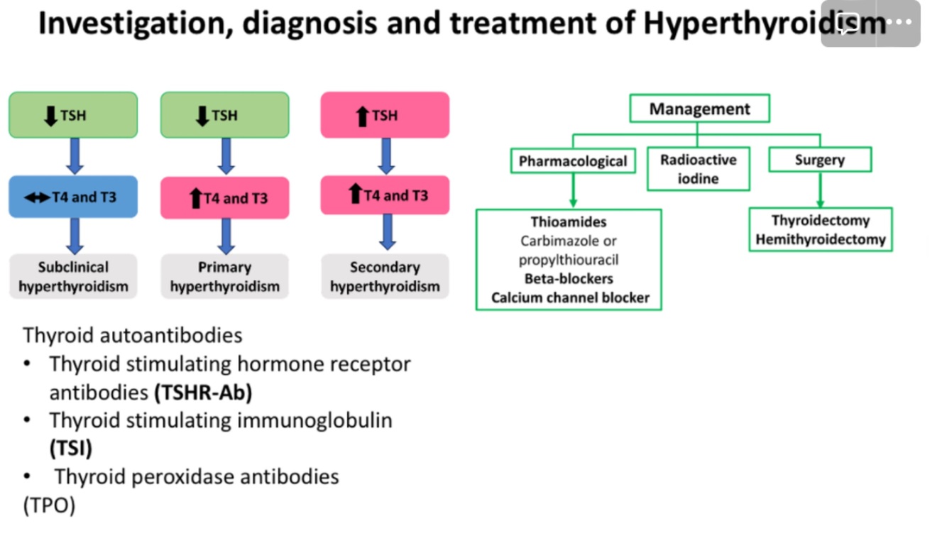 What are the investigations and treatment for hyperthyroidism?