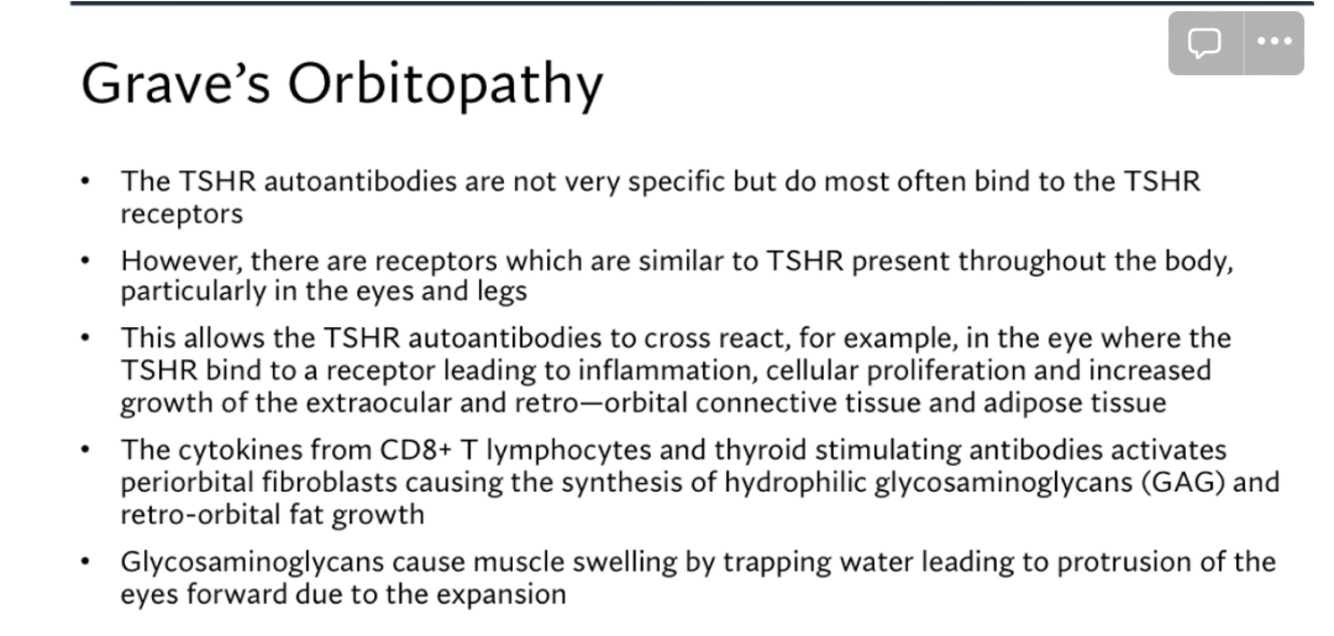 TRAb–TSH receptor antibodies binds to TSH receptor antigen → T cell cytokines → fibroblasts GAG deposition.
