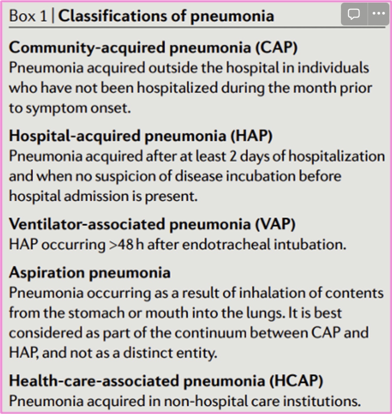 Community-acquired pneumonia (CAP)- Pneumonia acquired outside hospital or healthcare facilities