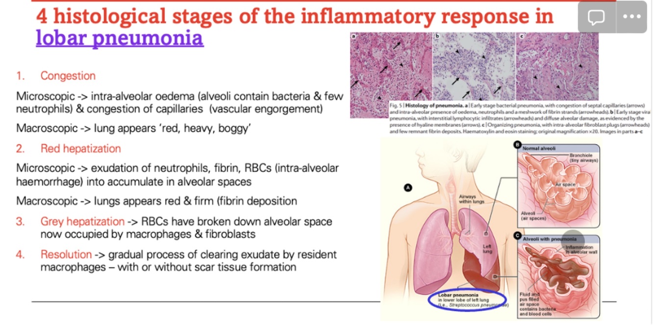 What are the histological changes in pneumonia?